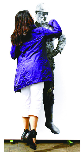 李舸特別提到《上善若水礦工情》,那是一幅觀念攝影作品,一位藍衣白褲的時尚女青年親切擁抱白色紙板上與真人一般高矮的礦工人像?!芭⑷肀В嗌鷦友健2灰欢ㄒ膬煽谧又g擦汗、遞水。影像應該有隨意性、去標簽化,應該反映攝影者的心理感受。”