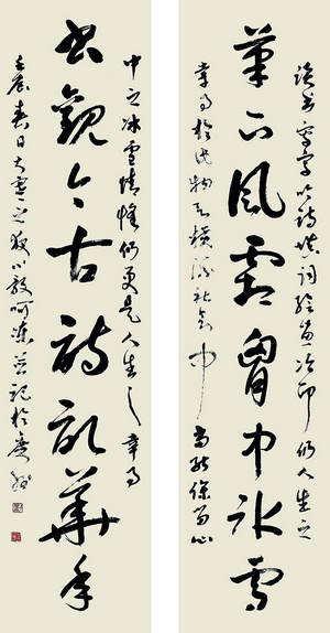 近年來,劉小毅加大探索大字創作的力度,試圖拓寬自己的“圓周”。他首先注意外拓筆法的運用,對使轉輕松的關注度提高了許多,對筆的調控更加自如,連執筆的位置都調高了許多,這是技法上的改進;在師法對象上自然也有了變化,他的筆下有了顏真卿、王鐸、傅山等人行跡,形態更趨于開張、寬博,飛動、跳蕩的筆調更加明顯,黑白、虛實的對比更加強調,空間、墨色的營構更為用心。最讓我驚訝的是,他的筆觸有了許多的重、厚甚至拙的形態,立體的墨象在運動中產生一種雄強之勢,與他本已具有的清雅之氣相結合,審美的豐富性大大增加,頗為動人,這或將是他要尋覓的新的意象。