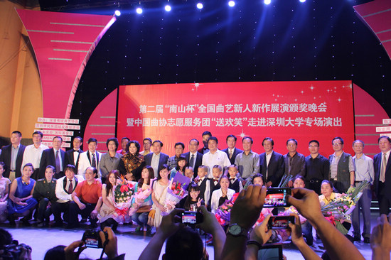 5月4日,第二屆“南山杯”全國曲藝新人新作展演暨中國曲協(xié)志愿服務(wù)團“送歡笑”走進深圳大學(xué)專場演出在深圳大學(xué)舉行。圖為出席頒獎晚會的領(lǐng)導(dǎo)與演員及獲獎代表合影