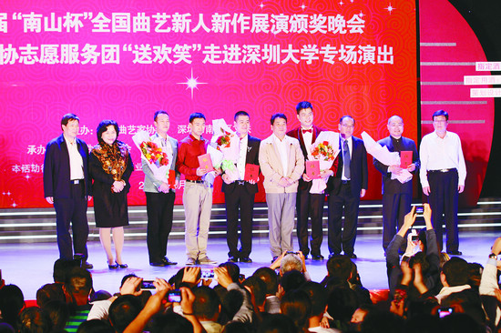5月4日,第二屆“南山杯”全國曲藝新人新作展演暨中國曲協(xié)志愿服務(wù)團“送歡笑”走進深圳大學(xué)專場演出在深圳大學(xué)舉行。圖為出席頒獎晚會的領(lǐng)導(dǎo)為獲獎?wù)哳C獎
