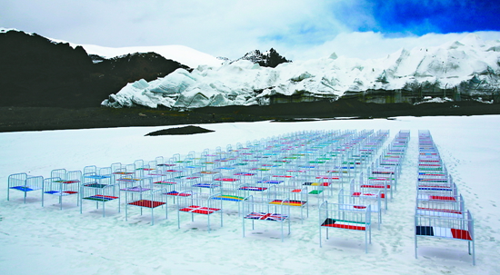 由于城市化的快速發(fā)展和城市規(guī)劃的不斷擴(kuò)大,城市人口增加,有些城市任意擴(kuò)大建設(shè)規(guī)模,配置產(chǎn)業(yè)不合理,計劃失控引起供需緊張,使缺水問題日益嚴(yán)重,且另一方面,城市用水浪費(fèi)、水污染等情況嚴(yán)重,加劇了水資源問題的嚴(yán)峻性。《長江源頭的嬰兒床》(照片投影、紀(jì)錄片,2010年)這件作品就揭示了這樣一個事實(shí)。艾松把192張畫有各個國家國旗的嬰兒床(象征著聯(lián)合國中的192個國家)搬到了長江的源頭唐古拉山脈,拍下了以上的紀(jì)錄片及照片。作品中的畫面十分雄偉,蔚藍(lán)的天空映襯著雪白的山脈,但在這美麗的環(huán)境中卻隱藏著巨大的水資源隱患。長江在唐古拉山脈的源頭已后退600米,冰川的縮小與人們過度使用水資源的關(guān)系緊密。而藝術(shù)家選擇使用嬰兒床則是希望提醒人們要為我們的下一代著想,思考現(xiàn)今嚴(yán)峻的形勢。同樣表現(xiàn)城市化過程中水資源問題的藝術(shù)家大衛(wèi)·黑里帶來的作品則提醒居民保護(hù)水資源與我們自身生活關(guān)系密切,切勿忽視。
