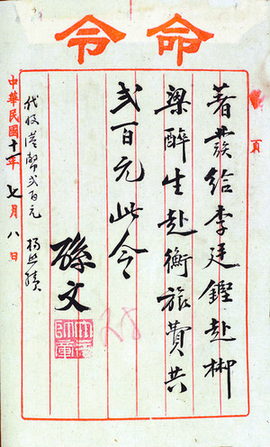 孫文飭發李廷鏗、梁醉生旅費手令