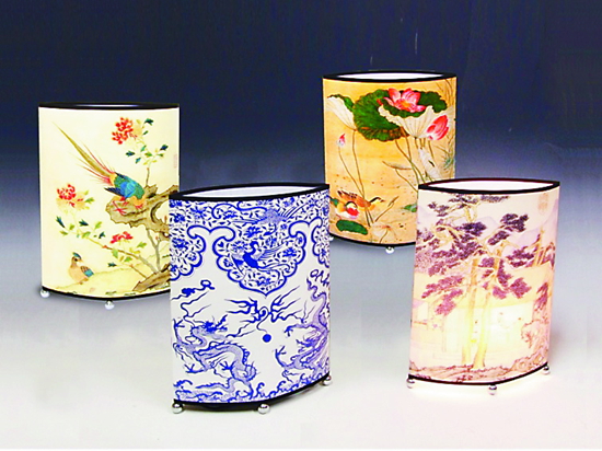 圖為上海博物館設(shè)計(jì)開發(fā)的畫作式桌燈,其中青花桌燈選取日本出光美術(shù)館的參展品設(shè)計(jì)而成,描繪海水中的雙龍戲珠,上半部分繪云肩紋,內(nèi)有纏枝菊花,兩只彩鳳上下飛舞。另有3款畫作式桌燈源于上海博物館藏品中清代吳振武的《荷花鴛鴦圖》、明代文徵明的《珍賞齋圖軸》,以及顧繡精品《濃香文錦圖》。
