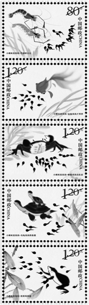 中國動畫藝術(shù)史上第一部水墨動畫《小蝌蚪找媽媽》,1961年由上海美術(shù)電影制片廠出品,講述了一群小蝌蚪尋找媽媽的具有科普意味的故事。據(jù)此改編的郵票,描繪了“巧遇蝦公公”、“金魚媽媽大眼睛”、“螃蟹媽媽白肚皮”、“烏龜媽媽四條腿”、“找到媽媽啦”五個故事情節(jié)。全套郵票5枚,郵票全套價值5.6元,同時發(fā)行郵票小本票。