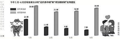 與近代革命劇形成鮮明對比的是,同期通過總局備案公示的現實題材劇卻相較往年大幅增加,從2013年1月開始到4月,當代都市題材分別為39部、31部、32部、36部。廣電總局去年曾要求衛視把現實題材播放的比例增加到45%,上月,總局又再次重申加大現實題材比例。