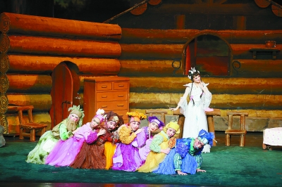 戲一開場,森林中一群可愛的小動物紛紛亮相,小白兔、小鹿、青蛙、烏龜作為串場,從臺上跑到臺下,與小觀眾拉手、轉圈互動,一下子活躍了現場氣氛,吊起了小朋友們的胃口;七個小矮人以矮子功出場,更是吸引了小觀眾的眼球,笑聲四起。七個小矮人經白雪公主許愿長高了之后,每個人有不同的武功表演,跟頭、旋子、肘棒子、鐵門坎,讓觀眾眼花繚亂。演到七個小矮人以重新變回矮子身救下白雪公主時,場下一片歡欣鼓舞。1小時15分鐘的戲讓孩子們坐住了,更看懂了。