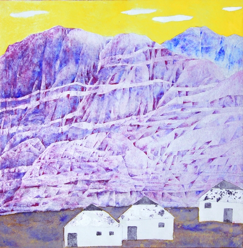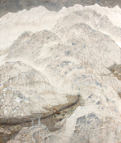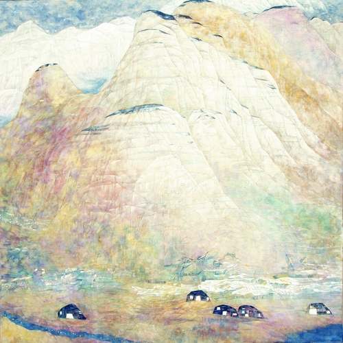 為提高畫面由對比而產生的強烈感染力,孫愷探索了不同礦物材料帶來的剛與柔的對比效果。如顏色與箔放在一起,顏色會顯得柔軟,箔就會顯得剛硬。又如蛤粉與礦石的顆粒用于同一畫面,蛤粉顯得柔軟細膩,粗顆粒的礦物色就顯得硬朗干澀。為豐富礦物顏料的多樣性,她在寫生過程中總是留意搜集各種不同的彩色礦石。每次發現她都會如獲至寶,將它們從遙遠的山區歷經長途勞頓背回畫室,然后親自研磨、研制成純天然礦物顏料。孫愷還認真研究巖彩與水墨的結合。中國水墨畫是以水調色,而顆粒狀的礦物顏料則是以膠為載體用于畫面的。如何解決水色、墨與巖彩在繪畫過程中能運用自如,孫愷著實探討并下了一番苦功。她在一遍又一遍地艱難探索過程中,終于逐漸確立了屬于自己的一種繪畫施色方法,即用巖彩的深淺變化替代了傳統國畫墨、色的水性變化。以水墨筆法用于巖彩的施色造型,以用筆的方圓正側、轉折頓挫,塑造巖彩畫作中變化多端的物體形象。在隨后多次的繪畫實踐中,她精心創作的各種題材的巖彩畫作品,普遍得到了美術界專家學者們的高度贊揚與肯定。