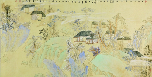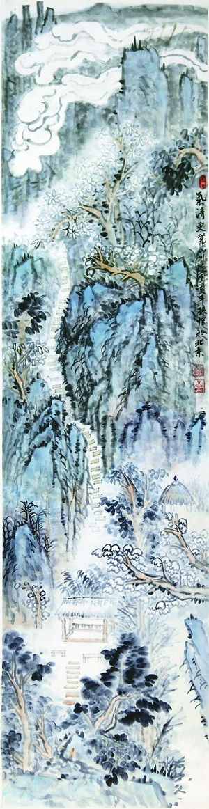 一個畫派的誕生,往往依賴于一種藝術風格的形成。巖彩作為中國最古老的美術色彩表現形式,出現在原始的半坡彩陶及馬王堆帛畫和漆畫之中。及至唐代,工筆重彩則成為鼎盛一時的時代美術標志。元代以后興起的“文人畫”、“水墨畫”,將工筆重彩沖擊成為民族的邊緣畫種。在當代藝術多元化的勢態之下,工筆重彩又煥發出了令人欣喜的藝術魅力。孫愷近年來的中國畫山水創作,在原先的重彩基礎之上,通過自己孜孜不倦的探索,逐步形成了一種有別于他人的沒骨巖彩畫法。學術意義上的巖彩畫色彩體系是由純天然礦物色、新巖礦物色、水干色、云母色和閃光色五大類組成,并結合金屬箔來完成作品,巖彩畫是一個自由寬泛的概念,沒有過多的程式化與既定的要求。進入二十一世紀后,巖彩畫已經被美術界諸多畫家廣泛運用到許多大型創作之中。難能可貴的是,孫愷在繼承傳統的基礎上發展并推進了巖彩畫的藝術表現形式,通過自己多年持之以恒、堅韌不怠的反復探索,逐漸形成了屬于自己的特立獨行、與眾不同的表達方法。她的作品融匯中西,她的人物和花鳥,既有傳統的勾線填色,又融入了西方繪畫的色彩構成。在她創作的數量可觀的山水畫作品中,由不同顏色的顆粒反復疊加產生的那種強烈視覺效果,既具有一種意象朦朧的感覺,適合東方人的審美習慣,又突出了山石樹木層層疊疊相加而產生的那種自然肌理特征,真正達到了和諧統一的藝術效果。
