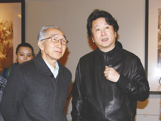 原中國美協(xié)主席、著名畫家靳尚誼與張江舟在展覽現(xiàn)場