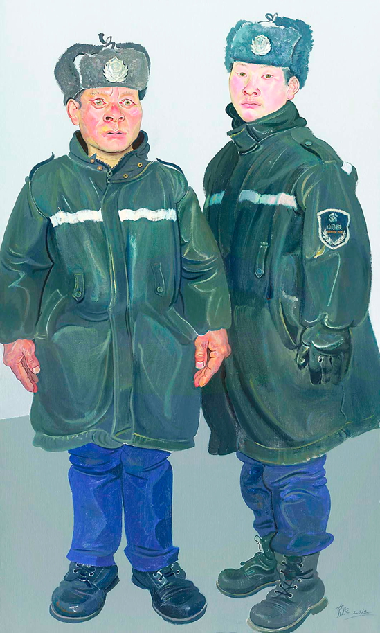 楊飛云之言“跨越常態的審美”,指的是忻東旺常以堅實、矮篤為造型特點,人物沒有大范圍的肢體運動與結構,只有沉重的站立與凝視,是畫家內心感受的外在表達。忻東旺坦言變形有違于人們看油畫的視覺經驗,但他認為,客觀正常的比例,是沒有表情和情趣的。“西方藝術也不是以客觀準確為標準,它會崇拜神性精神,因而人物會高大威嚴;但中國藝術講求天人合一,人在自然中,是渺小、謙卑、內斂的,它表達的是世俗生活的情趣。”他以油畫表現當下的中國人,追求的是中國人的意象,因而變形,是為了更真切、更真實。“為什么要變形?中國寫實繪畫,研究西方傳統,幾代人在做努力,用全部的精力去研究西方造型傳統,但畫出來的畫還是不夠感人。具象繪畫的精髓應該在哪里?它的造型體系、理論體系應該在哪里?我覺得不是自然的、客觀的真實,應該是發自于人們內心的真實,也就是說,畫畫不是畫眼睛所看到的,應該畫心靈解讀到的。在這種意義上,一定要變形,變形是為了表達得更為真實、更為準確。”