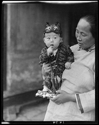 民國時期的人物肖像,戴虎頭帽的小孩。