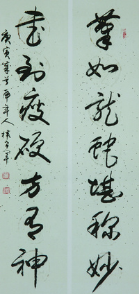 我學古不薄今,對今人的書法也隨時留意學習,不是學習某人某派,而是按照個人的審美情趣,不論是誰,只要認為其書有可取之處,都學習。學習今人可與時代接軌,在作品中融入時代精神。如此學古習今、兼收并蓄,經過多年的磨煉、融合,最后形成了以草書和行草書為創作主要書體的基本書風。這一書風較大草收斂,較今草狂放,我取名曰“大小草結合”。書作力求遒勁瀟灑,結體靈秀,筆意奔放,氣勢連貫,骨力內含,表現出一種中和之美,實現雅俗共賞。