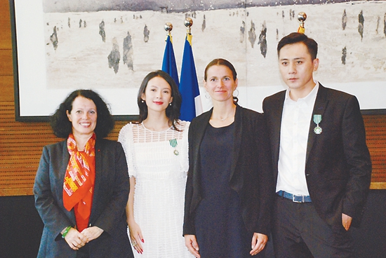 6月27日,在法國駐華大使館大使官邸,法國文化部長奧蕾麗·費利佩蒂為中國演員章子怡、劉燁頒發了法國藝術與文學騎士勛章。