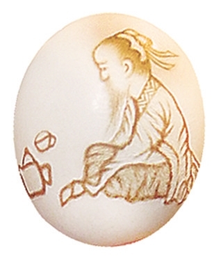 武俠中的江湖高手往往大隱隱于市,其武功出悟于尋常生活。蛋雕江湖亦是如此。好的蛋雕作品不僅僅在于精致,更因其取材于生活,能夠表現豐富的生活內涵。張宇的蛋雕作品恰是遵循了這一江湖道理。他遍翻圖書,尋找有特點的形象,革命人物、西游人物栩栩如生;關注社會時事,福娃蛋雕等與時俱進;胡同里散步之余留心觀察,撂鼻涕、剔牙、打哈欠等老北京人典型形象就變成絕佳的素材;甚至是一句詩也經過加工創作躍然于蛋殼上:“閉門靜坐自己過,閑來莫論他人非”,張宇繪一老翁靜坐,面前擺一茶壺茶杯,畫面簡潔意蘊深長。好學篤行,即是成就蛋雕武功的精髓所在。