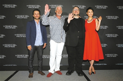 主演查理·戴、朗·普爾曼、導(dǎo)演德爾·托羅和女主演菊地凜子(左起)出席了《環(huán)太平洋》首映。