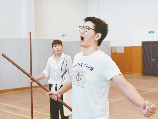歌劇《女武神》排練現(xiàn)場,王威(左一)飾演布侖希爾德,於敬人(右一)飾演沃坦