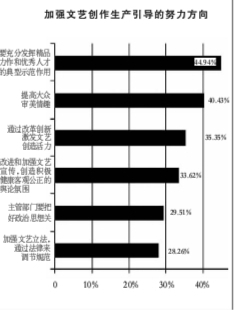 當下文藝創作生產領域存在的諸多問題,一個重要原因是法律規范滯后于文藝發展變化的需要,28.26%的人認為應該“加強文藝立法,通過法律來對文藝產品創作生產進行調節規范”。怎么辦?一抓清理。對當前文藝領域的各種侵權行為進行梳理,研究哪些需要通過健全法律法規來約束,哪些需要通過完善政策制度來規范;對涉及文藝創作生產的現有法律法規和政策文件進行系統清理,研究哪些需要調整修改、哪些需要細化完善。二抓立法。在充分調研的基礎上,針對文藝創作生產領域存在的突出問題,根據文藝繁榮發展的現實需求與長遠趨勢,分類推進文藝立法,把我們黨關于引導文藝創作生產的政策主張上升為法律規范。三抓執行。重點加強文化市場管理、“掃黃打非”、文藝產品播映展演等方面的執法和監管,依法依規凈化文化市場,懲治侵權行為,維護文化市場秩序,規范文藝創作生產活動,保護好文藝創作生產者的權益和熱情。