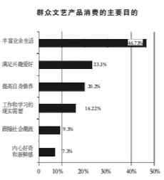 人民群眾物質生活的極大豐富帶來對精神文化的旺盛需求。由于經濟條件、生活環境、教育背景、思想觀念、興趣愛好等個體差異,人們對文藝產品的需求呈現多元多樣的特征,文化消費需求層次參差不齊。調查顯示,對于文藝產品消費的目的,選擇“豐富業余生活”“滿足興趣愛好”“提高自身修養”“工作和學習的現實需要”“跟隨社會潮流”“內心好奇和新鮮感”的,分別占46.73%、23.3%、20.2%、16.22%、9.3%、7.3%。這說明,多數人希望通過文化消費受到藝術熏陶、提高審美水平、提升生活質量。但同時,一些人熱衷于感官刺激,喜歡低俗庸俗媚俗、泛娛樂化的東西。他們認為,文藝作品應該“講求娛樂性,迎合觀眾口味”,可以“追求新奇,顛覆傳統,穿越惡搞”。在他們看來,韓國歌曲《江南style》、“鳥叔”的騎馬舞、被戲稱為“神曲”的歌曲《法海你不懂愛》也屬優秀作品之列。針對當前文藝創作生產面臨的主要問題,選擇“現在有不少人熱衷于低俗、庸俗、媚俗的東西”的占44%。