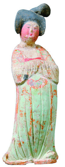 圖中這件自西安市長(zhǎng)安區(qū)茅坡唐墓出土的彩繪拱手仕女俑,仕女立俑頭略側(cè)斜,梳拋家髻,面龐紅潤(rùn),娟秀的眼瞼上以細(xì)墨描曲眉,透明的眼凝望前方,以朱紅點(diǎn)染的嘴唇微微翹起,泛出甜美的微笑,身穿圓領(lǐng)白底彩花窄袖衫,雙手藏于袖中拱貼胸前,橙黃色披巾繡有各類(lèi)花朵,由前腹搭向雙背后下垂至后腿部,下著淡綠色曳地長(zhǎng)裙,紅色裙帶系胸下部,透裙可見(jiàn)一腳。從面容身段看,該仕女肥胖而不臃腫,豐滿卻輕盈,具有端莊柔美、風(fēng)韻卓絕、婀娜青春之美,使人感到這并非是一個(gè)靜立的俑人,她身軀微微扭轉(zhuǎn),右肩略抬起,雙目生輝,朱唇含笑,真是“媚色艷態(tài)”,雖經(jīng)過(guò)千年,仍光彩照人。