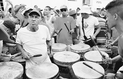 擊鼓的隊伍和跳舞的人群離開廣場,來到村中一條街道上,將這條小街擠得水泄不通。我們只能登上臨街樓房的陽臺向下俯瞰:擊鼓手分成若干個隊伍,他們圍著鼓,揮棍擊鼓,相互比試,鼓聲一浪高過一浪;舞者圍成圈,對對男女在圍觀者的呼喚聲里輪番上場狂跳。雖然已是夕陽西下,民眾興致依然不減。菲利克說,“我們一直要鬧到午夜來臨才回家”。