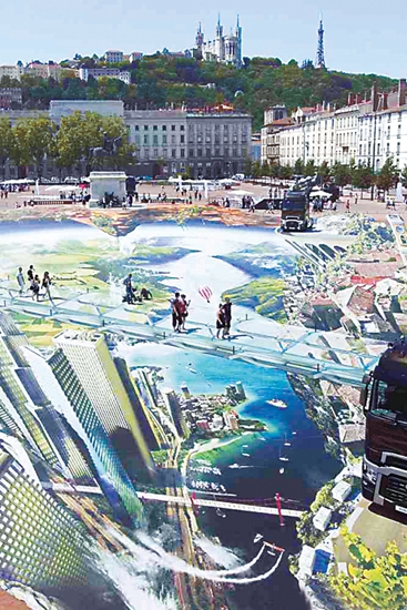 這幅巨大的畫作猶如一座地下城市,畫家通過色彩豐富的層次運用達到三維立體效果,給人一種步入超現(xiàn)實世界的錯覺。活動期間,這件3D畫作平鋪在地面上,人們可以隨意走上去,體驗身臨其境的奇妙感覺。遠方的風景和城市的摩天大樓都如此逼真,在畫中的高架橋上走動,“居高臨下”的滋味甚至會令人忘記自己其實身在畫中。許多當?shù)鼐用袂叭ビ^看,除了感受神奇的藝術作品外,還可以坐上雷諾卡車的新車型進行一番體驗,可謂一舉兩得。