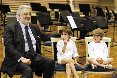 7月14日,西班牙男高音多明戈和兩個孫子出現在馬德里皇家歌劇院《郵差》的排練現場。圖/IC