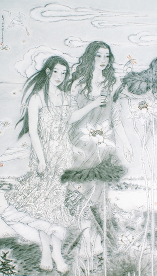 奮英畫(huà)面的主體是清一色的長(zhǎng)發(fā)、長(zhǎng)裙、裸肩玉臂的妙齡女子,相伴蓮蓬荷葉、白鷺樹(shù)林、江流漁舟與風(fēng)輕云淡,個(gè)個(gè)含蓄幽靜、深情嫵媚。她們手持音樂(lè)播放器、手機(jī)或電腦等現(xiàn)代電子設(shè)備,給人的感覺(jué)卻好像是《詩(shī)經(jīng)》中的美人——“蒹葭蒼蒼,白露為霜,所謂伊人,在水一方”。這也使我們?cè)俅慰吹搅藠^英所選擇“水痕描”的魅力所在:這些清奇美麗的女主人公,告別了周昉、張萱類的綺羅人物的閑愁,也有別于今日消費(fèi)時(shí)代順流而下的時(shí)尚女子的平面、淺薄與輕狂。