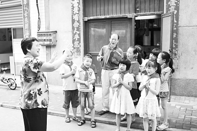尹秉華(中)教學生唱紅歌。 光明網記者 唐天攝