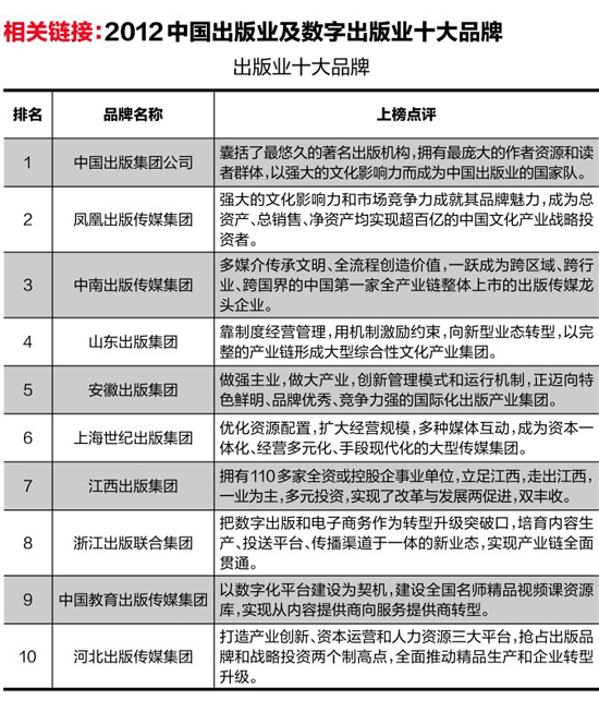 《報告》遴選了30個在各門類具有引領意義的文化品牌,它們包括:電影品牌、電視娛樂節目品牌、地方綜合性網站品牌、視頻網站品牌、傳媒集團品牌、民營書業品牌、報業集團品牌、報紙品牌、文化產業投資品牌、電影院線品牌等。這些入選的年度文化品牌是依據“經濟體量、年度業績、業界聲譽、社會影響、品牌價值”的總原則,經傳媒舉薦、團隊調研、專家評審、網絡投票、公示反饋等環節遴選出來的。