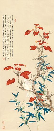 紅葉雪鳩(紙本水墨重彩設(shè)色立軸) 任 重
