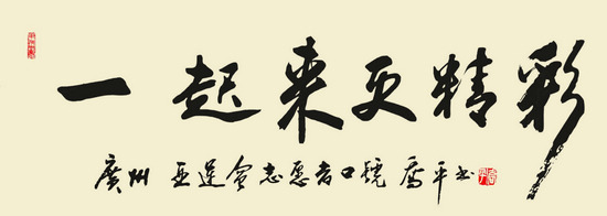 “一起來,更精彩。”這句話,作為2010年廣州亞運會志愿者口號,影響甚廣;在亞運會舉辦的前前后后,也以書法的藝術形式在廣州市的大街小巷、在亞運會的比賽場館、在亞運村的各個房間、在志愿者的穿戴服飾上流傳。那首譚晶演唱的亞運會主題歌《一起來,更精彩》,從頭至尾,畫面上始終流動著這幅書法作品,就連譚晶的衣服上也印著。該作品為紙本,4尺橫幅,現收藏在廣州亞運會博物館。