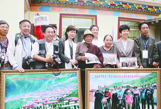 趙實等看望玉樹結古鎮禪古村村醫巴桑扎西,并向他贈送攝影志愿者們為他拍攝的全家福等照片。圖為趙實和老人以及王瑤、解海龍、包旭東等著名攝影家合影。