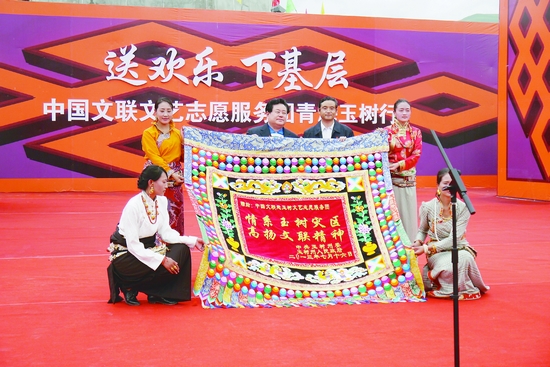 玉樹州向中國文聯贈送錦旗表示感謝。