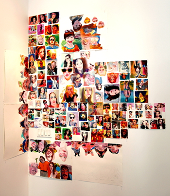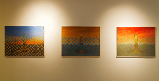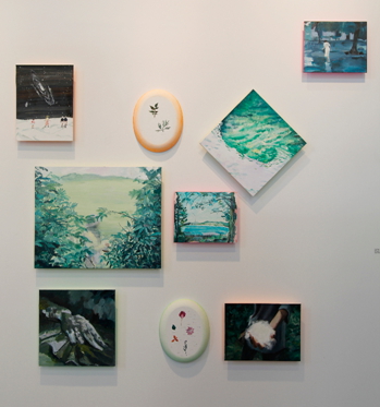 來自中央美院的年輕藝術家在紐約游歷創作的作品,融入了文化沖擊帶來的新鮮元素,又隱含著在新文化中的焦慮感。紐約街頭的多元文化特征體現在杜鵬驕和丁鈺的作品。杜鵬驕抓住了這個五光十色的大都市不同族裔、職業、性別的面孔,拼貼在一起,像是快速閃回的膠片。丁鈺則捕捉了在時代廣場跳動的股票信息前的一張亞洲面孔——充滿好奇的自己的面孔。魏穎同樣也畫了自畫像不過她所表現的是處于畫室內的場景,畫面中鏡子分割了遠處的風景,同樣自身也處于風景之中。而趙沛然及曲丹兒把自己的切身感受明確的體現在畫面中,前者畫了MOMA美術館彩色燈光的扶梯,用幾何分割的構圖試圖闡釋人與人,人與空間的關系,后者則是把在紐約生活的瑣事串聯起的細節以一種超現實的手法,錯亂的空間,以及斑斕的色彩記錄在畫面中。范墨把他童年記憶中的集體合影中移植入美國文化的卡通符號。袁偉和周棟則抓住了美國中產階級夏日的典型生活——海灘度假。周棟筆下的胖女人專心地曬著太陽,用粗獷的筆觸表現出曬紅皮膚上新鮮泥土的痕跡。苑瑗以一組尺寸可變的小油畫表現了自己在紐約的狀態,沒有摩天大樓和車水馬龍,安靜的湖泊和星辰讓人出離喧囂。趙一霓的一組風景油畫延續了自己對中國傳統文人畫內觀境界的追求,近乎抽象的線條注重對內心的反映,藝術家說在紐約的體驗讓她找到了更準確的語言,在圖像的表達上也更自由。李興達的《墻》則用幽默的語言反映出無所不在的隔閡。自由女神、毛澤東和麥當勞小丑站在紀念碑的基石上,以統一的姿勢揮手。觀者的視線被雕像前橫空出現的籬笆所阻擋,不知自己身處墻內還是墻外。