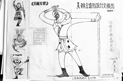 嚴定憲為《大鬧天宮》設計的孫悟空形象。左側三種造型為著名裝飾畫家張光宇先生所設計,嚴定憲的設計系在此基礎上重新修改。本報記者 顏維琦攝