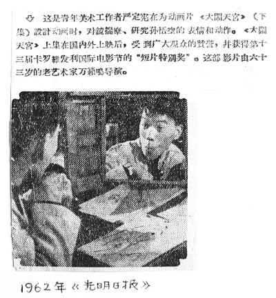 當年,《大鬧天宮》的動畫設計組每人桌上一面鏡子,對著鏡子揣摩表情、口型的變化。1962年,《光明日報》刊發了嚴定憲的工作照,這張剪報嚴定憲一直收藏至今。本報記者 顏維琦攝