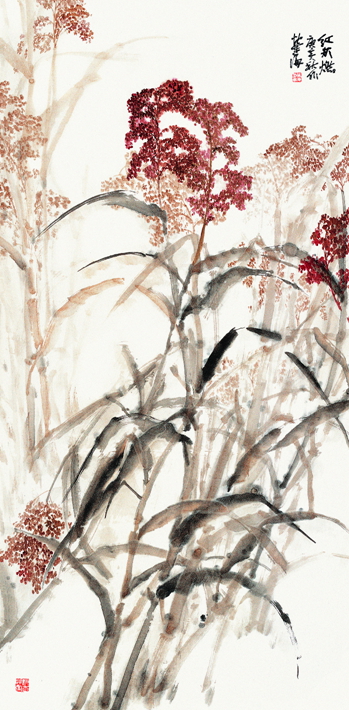 李榮海的國畫創作根植于他的全面修養和書法功力,他從農村走來,對農村生活的情結,對農家深厚的情感,點燃了他不熄的藝術火花。他的花鳥畫多以農村所見為題材,高粱、玉米、大白菜均入筆端,他的筆名“耕夫”,印鑒“家在魯西黃河古道”、“耕夫草堂”,無不帶著深厚的農家情感,“耕”是他作品中出現最多的一個字,勤奮耕耘是他成功的根本所在。他的作品貫穿了一條完全傳統的中國文人畫的軌跡,所選題材大致都在傳統文人畫范疇,但時時有自己生存環境中的所見所聞。書法中的布局開合直接影響了他的繪畫,書法中的用筆更是直接用于造型手段,“直從書法演畫法”,在他的畫中同樣體現出他的書法底蘊,若除去表面的濃淡干濕,筆墨核心是中鋒用筆,體現出凝重厚實的品質,進而引申入墨。而在書畫背后可以清晰地看到的是他的做人、工作、性格、品德的巨大作用,這是傳統文人畫的精粹所在,也是中華民族精神“自強不息、厚德載物”和“寫意”的藝術精神之所在。他走過的藝術道路給了我們新的啟示,中國傳統的文人畫會在未來煥發青春,文人畫道路不但能行得通,而且必將影響更多的后來人。