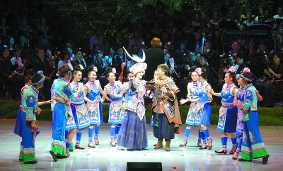 “《仰歐桑》將一個(gè)古樸的苗族傳說發(fā)揚(yáng)光大,展現(xiàn)了苗族的美麗文化。”李飛躍說。生活在黔東南的苗族人能歌善舞,他們的生活里不僅有動(dòng)人的故事,也有美妙的音樂、舞蹈和絢麗的服飾。由于地處偏遠(yuǎn),這些美麗的苗族元素沒有太多機(jī)會(huì)走出大山。如何將豐富的苗族文化進(jìn)行濃縮,將它們帶出大山向世人展示?《仰歐?!方o出了一個(gè)完美答案。