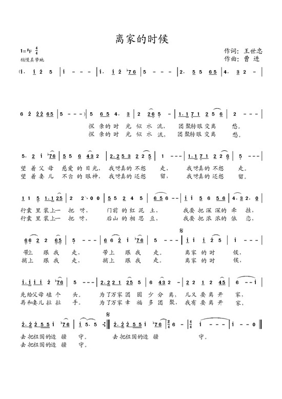 前不久在海南參加一個(gè)部隊(duì)的群眾文化創(chuàng)作筆會(huì),見(jiàn)到著名作曲家曹進(jìn),他和空軍干部王世忠合作的新歌《離家的時(shí)候》,抒發(fā)了部隊(duì)官兵舍小家、為大家的精神,旋律優(yōu)美,情真意切,受到與會(huì)者的一致贊賞。這首歌經(jīng)軍旅歌唱家劉和剛演唱,已在網(wǎng)上獲得極高的點(diǎn)擊率。
