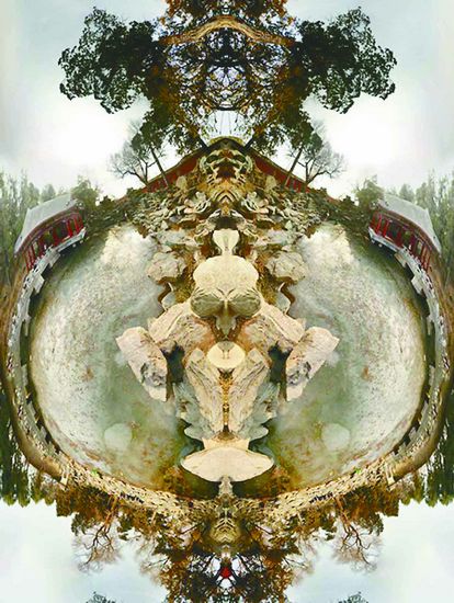 展覽中李戈的攝影作品充滿著樹的靈性,他說:“我去散步時(shí)到了孔廟,無意中發(fā)現(xiàn)了一棵樹,他使我聯(lián)想到孔子及古代的人??讖R里的樹都有著上百年的歷史,仔細(xì)觀察的話你會發(fā)現(xiàn)那些樹的樹癤子有的像人的眼睛,有的像鼻子,都很有神秘感。于是我對同一位置的景物進(jìn)行明暗對比的拍攝,然后將圖片對接合成,結(jié)果就如同大家所看到的這些作品:天空很藍(lán),葉子是綠色的,對比效果被削弱了,在黑色的陰影里依舊可以看到清晰的細(xì)節(jié)。”對于自己的作品,李戈說其中有一部分是他在拍攝時(shí)就已經(jīng)知道了自己想要的效果,另一些則是他在大量地隨機(jī)拍攝后到電腦制作時(shí)又偶然間產(chǎn)生的新發(fā)現(xiàn)、新構(gòu)想。