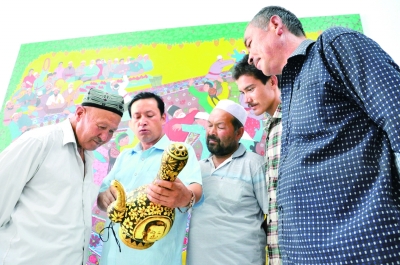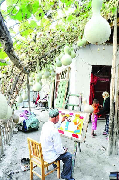 “我從小就愛畫畫,還常被老師批評(píng)不好好學(xué)習(xí)。”農(nóng)民畫家熱合曼·阿皮孜說(shuō),他沒經(jīng)過任何專業(yè)訓(xùn)練,就是把自己民族的風(fēng)俗習(xí)慣和發(fā)生在身邊的事兒畫進(jìn)畫里。但這種完全來(lái)自生活的原生態(tài)創(chuàng)作,以極其自由的造型風(fēng)格和淳樸自然的藝術(shù)表現(xiàn)手法,描繪出一個(gè)個(gè)彩色的刀郎文化夢(mèng)。