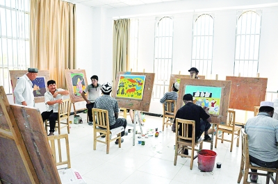 為了扶持這一特色文化,麥蓋提縣成立了農(nóng)民畫協(xié)會(huì)和專業(yè)合作社,還由政府出資給優(yōu)秀畫家成立了工作室。熱合曼就享受到了這種待遇,他在自己的畫室里帶出了70多名徒弟。