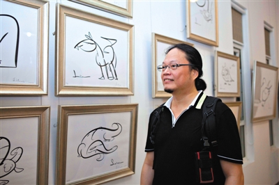 蕭言中以創作單幅幽默漫畫著稱,此次展出的“The MOMENT——蕭言中作品展”是一直堅持用蘸水筆作畫的蕭言中首次嘗試擺脫畫筆、墨汁的束縛,用平板電腦創作的作品。
