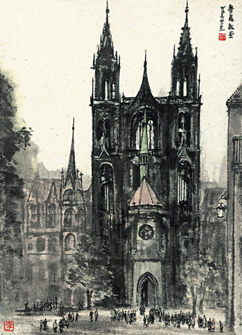 此次展覽的作品共分3個部分進行展示,其中李可染先生的60余幅作品可謂最大亮點,包括《采菊東籬下》《秋風陡然起》等大家比較熟悉的作品,也有《麥森教堂》這樣頗為罕見的國畫創作。這幅創作于1957年的作品描繪的是德國典型的哥特式教堂,李可染先生以堅實的素描和筆墨功底,連同敏銳的觀察力和感受力,將麥森教堂的神圣、莊嚴和神秘通過畫面充分地表現了出來,以極為民族化的筆墨展現出別樣的異國風光。