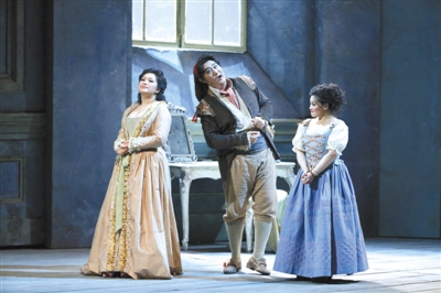 昨晚,國家大劇院制作的莫扎特歌劇《費(fèi)加羅的婚禮》首演。歌唱家沈洋(中)、黃英(右)領(lǐng)銜的中國版演員演繹了這部歌劇。此版由西班牙導(dǎo)演何塞·路易斯·卡斯特羅執(zhí)導(dǎo)。紐約大都會(huì)歌劇院簽約的80后歌唱家沈洋首次在大劇院舞臺(tái)上挑梁演出,以飽滿的嗓音詮釋了機(jī)智的費(fèi)加羅。花腔女高音黃英扮演的費(fèi)加羅未婚妻蘇珊娜,則以精致的唱腔與活潑的表演與高大、滑稽的費(fèi)加羅相映成趣。