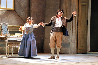 此次《費加羅的婚禮》在國家大劇院的戲劇場上演,整臺演出的布景,也一改大劇院以往的華麗風,而走了古樸簡約的路線,無論是墻體的紋飾,還是家具的雕花都再現了兩百多年前的歐陸風情。大幕拉開,費加羅與未婚妻蘇珊娜的婚房出現在舞臺上,而當第二幕伯爵夫人臥室的場景時,原本長方形的舞臺又變為三角結構,燈光通過一扇巨型窗有層次地射入。第三幕結束后,整個舞臺開始旋轉,場景也從室內轉到了戶外花園。由于戲劇場比歌劇院空間小,演員與觀眾的距離也縮短許多,同時聲音的表現力也更有力。對這部喜歌劇來說,觀眾時常能看到演員在舞臺前區表演,增加了不少親近感。