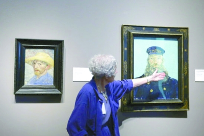 底特律藝術(shù)學(xué)院講解員在講解梵高《郵遞員魯倫》的細(xì)節(jié)