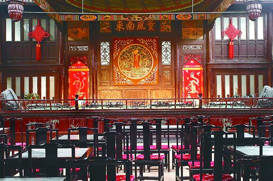 明清兩朝由于帝王對戲曲的濃厚興趣,宮廷演劇達到鼎盛。而宮廷戲臺源自于宮廷演劇,目前所能見到的宮廷戲臺多為清宮遺存。清宮戲臺根據(jù)形制和規(guī)模,又可分為室內(nèi)小戲臺、中型戲臺和院落式三層大戲樓。如北京故宮暢音閣大戲樓、北京頤和園德和園大戲樓等。宮廷戲臺的建設(shè)云集了當(dāng)時的能工巧匠,繼承了歷代戲臺建筑的先進經(jīng)驗,彰顯富麗堂皇、華麗精致的皇家氣派。而與之相對應(yīng)的私家戲臺的建設(shè)則與我國的堂會演劇密不可分。這些戲臺依主人的興趣和愛好而建,格局多樣,表現(xiàn)出較大的隨意性,選建地點有的在門廳室內(nèi)或庭院府第之中,有的與園囿池地連成一體,有的則置于船舫之中。如北京恭王府室內(nèi)戲臺、江蘇揚州何園寄嘯山莊戲臺等。