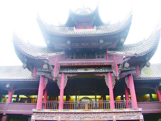 明清時期,戲曲是被人們廣泛喜愛的娛樂形式。明清以降,戲臺建筑的結(jié)構(gòu)雖發(fā)生了一些變化,但仍舊沒有徹底脫離金元時確定下來的基本樣式。此時,戲臺在設(shè)計、建造時,不僅對于采光、排水、音效的特殊要求都有所關(guān)照,且十分重視裝飾性,屋頂、斗拱、藻井、天花、立柱等,無不壯麗多彩,可謂絢麗繽紛、鬼斧神工,這也更加使得它們成為珍貴的物質(zhì)文化遺存。如四川自貢西秦會館,為三層重檐歇山頂,石木結(jié)構(gòu),屋檐呈飛翼狀,高高翹起。戲臺第一層為舞臺,上覆兩層,頂部呈六角寶塔形,頂端為葫蘆狀裝飾。臺沿和額枋上有木雕彩繪裝飾,結(jié)構(gòu)精巧,金碧輝煌。