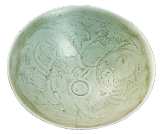 掩蓋在白沙中的青白釉弦紋執壺經過千年浸泡,受到海水侵蝕,雖已斑駁,但仍可一窺福建北部地區民間瓷窯的燒造水平。另一件青釉刻劃花紋“吉”字大碗內刻劃的篦紋是“華光礁Ⅰ號”打撈出的各類大碗中非常具有代表性的裝飾風格,刻劃篦紋所用工具雖然簡單,但線條紋樣變化多端、自然流暢,碗心的“吉”字是南宋福建地區南安羅東窯的產品特點。